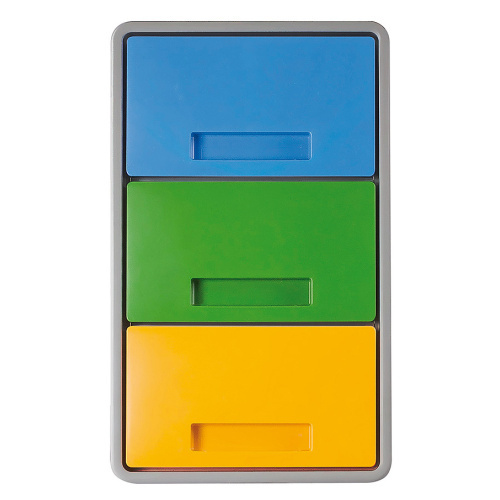 - Die Farbe des Behälters und der Trennwände ist grau, die Deckel und Beutelhalterungen sind blau, gelb und grün.