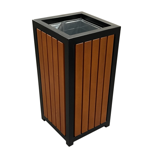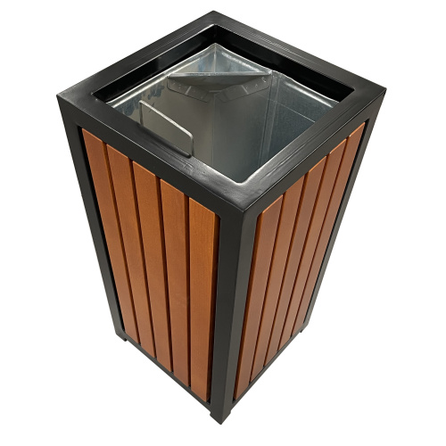 - Abfallbehälter für den Außenbereich mit quadratischer Stahlkonstruktion und Holzausfüllung.