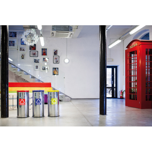 - Rostfreier Abfallbehälter zur Sortierung von recyclebaren Abfällen, wie Kunststoffe, Papier, Glas und weitere.
