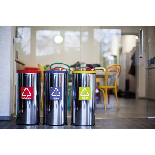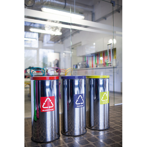 - Rostfreier Abfallbehälter zur Sortierung von recyclebaren Abfällen, wie Kunststoffe, Papier, Glas und weitere.
