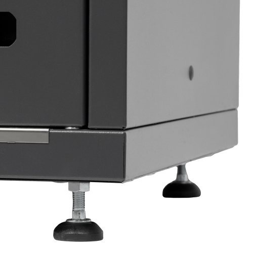 - Die Behälterkonstruktion steht auf zwei rutschfesten, verstellbaren Füßen und zwei Rollen.
