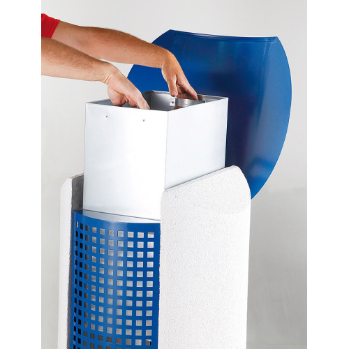 - Der Blechverschluss ist an zwei Scharnieren aufgehängt, nach Öffnen des Verschlusses kann die Einlage entnommen werden.