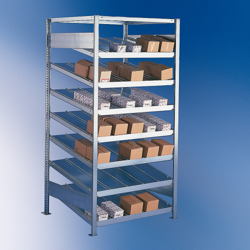 Einführung » LAGERLÖSUNGEN » Regale » Fachregale » Schraubenlose Regale » Fallregal einseitig Basisfeld Tiefe 800 mm