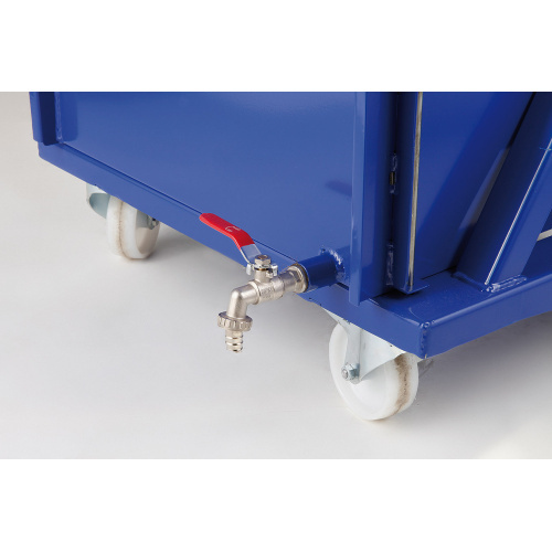 - Am Boden des Containers befindet sich ein Ablasshahn mit Schild, der es ermöglicht die abgetropfte Flüssigkeit (Öle, Emulsionen usw.) abzulassen.