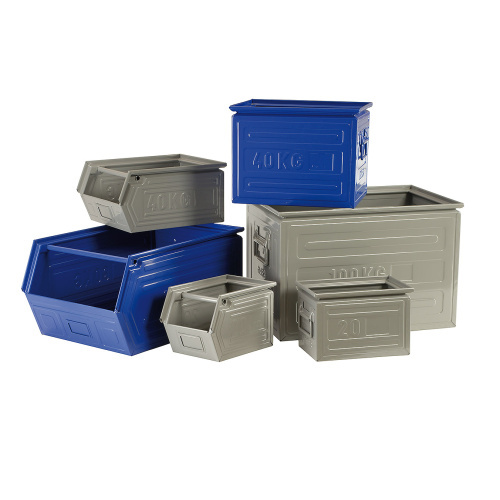 - Die Kisten bestehen aus Stahlblech. Standardgemäß ist die Oberfläche pulverlackiert, bei größeren Mengen ist eine Verzinkung möglich.