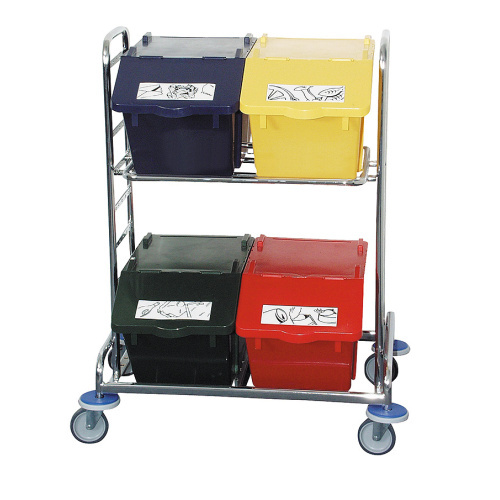 Das Komplettset setzt sich aus einem verchromten Rahmen mit Räder Ø 100 mm und 4 Behältern mit einem Volumen von je 45 Litern zusammen.