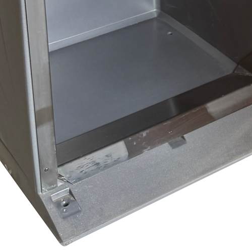 - Der Zugang zum Behälter erfolgt über eine Fronttür mit eingelassenen Metallscharnieren und Schloss.