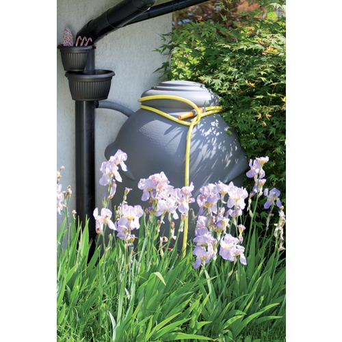- Das Regenwasser aus der Dachrinne kann durch den oberen Deckel bzw. mit Schläuchen von den Ableitungen an den Behälterseiten eingeleitet werden.