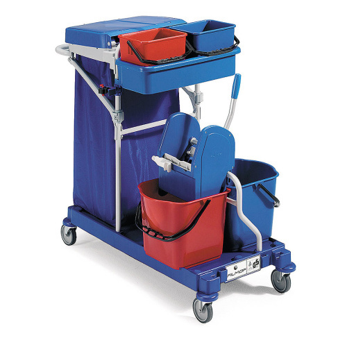 - Ausgestattet mit einer Halterung für einen 120 l Beutel (geeigneter Typ: 1077 ist nicht Bestandteil der Lieferung), zwei Behälter 6 l, verschiebbarer Einrichtung mit zwei Behältern 15 l, Besenhalterung.