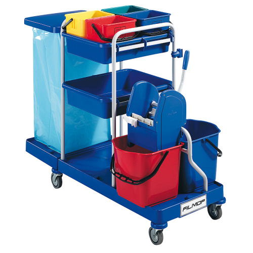 - Ausgestattet mit vier Behältern 6 l zur Separierung von Abfällen, zwei Behältern 15 l mit Presse, Halterung für PVC Beutel 120 l (geeigneter Typ: 1077, ist kein Bestandteil des Produktes) und einer Ablagefläche für Reinigungsmittel.