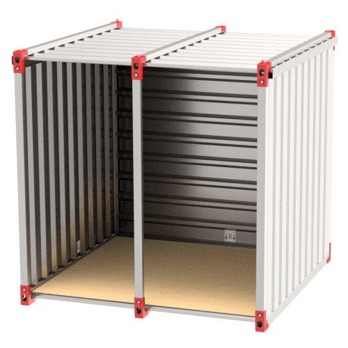- Wände und Dach mit Trapezblech Stärke 0,75 mm. Der zusammengebaute Container kann mittels Kran (Ösen an den Ecken) oder Gabelstapler versetzt werden.