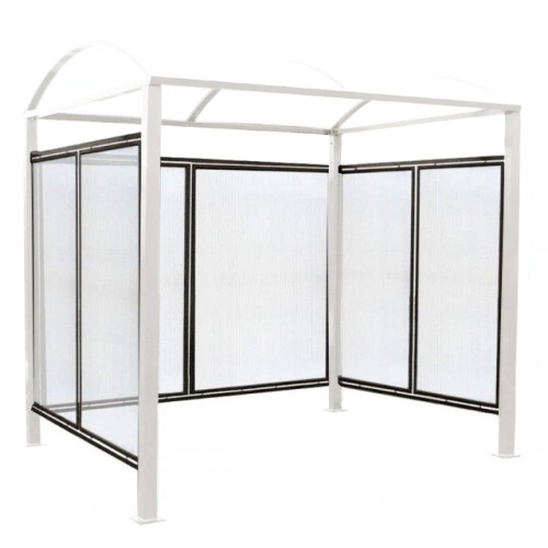 - Der Rahmen der Seitenwände besteht aus Aluminiumprofilen, verkleidet mit transparentem Polykarbonat mit UV-Schutz-Zusatz. Die Seitenwände und die Rückwand werden aus zwei Teilen gebildet.