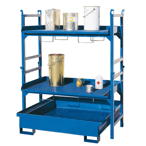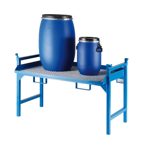 Stapelgestell aus Stahl mit Gitterrost zum Abstellen von Behältern mit Flüssigkeiten.