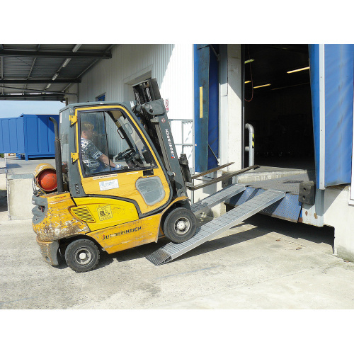 - Steife, leichte Aluminiumkonstruktion mit einer maximalen Tragfähigkeit von 500 kg. Die Rampe ist mit einem einzigartigen rutschfesten Drainageprofil ausgerüstet.
