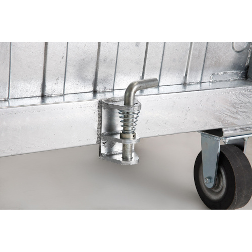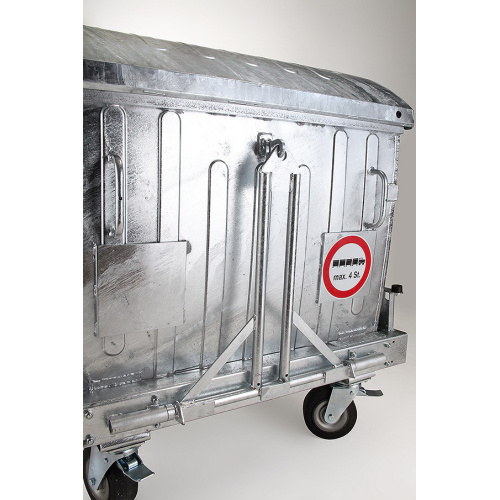 - auf Bestellung: versehen mit Zentralbremse, Deckelverriegelung, Fußöffnung, Firstleiste, öldichte Ausführung, Ausführung für die Handhabung mit Gabelstapler, Deichsel und Einhängevorrichtung, verschiedene Behälterverstärkungen, Schutzrahmen.