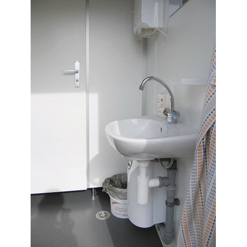 - Ausstattung: Eingangstür 875 x 2000 mm, Innentür 875 x 2000 mm, Innentür 625 x 2000 mm, ISO Fenster 945 x 1200 mm mit Rollo, ISO Fenster 600 x 600 mm, WC, Waschbecken, Batterie, Duschkabine, Boiler, Anschluss Wasser/Abwasser, Trennwand.